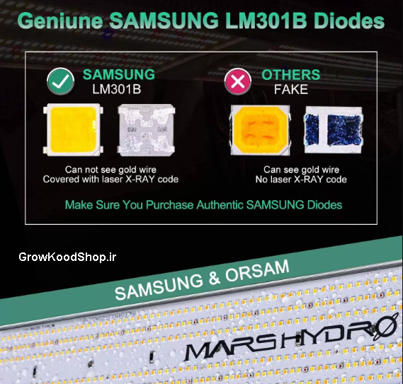 در این محصول از چیپ های مخصوص سامسونگ مدل LM301B و همینطور LED های UV و IR تشکیل شده است . چیپ های سامسونگ مدل LM301B جدیدترین مدل چیپ های رشد گیاه هستند که به تازگی توسط کمپانی های معتبر استفاده میگردد و در کنار چیپ سامسونگ از چیپ های 660 نانومتر اسرام نیز استفاده شده است .