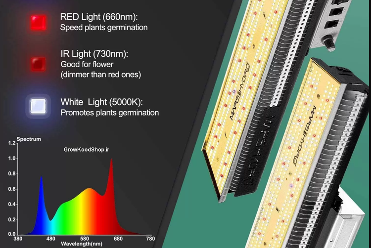اما در طیف نوری که به اصطلاح فول طیف نامیده می شود طیف نور های کلوین دار نیز قرار داده شده است که همراه ال ای دی های UV و IR هم برای رشد و برگ دهی و هم برای گلدهی و همینطور قارچ کشی و ضد عفونی ( بخاطر وجود نور UV) بهترین طیف ممکن برای گیاه را دارا می باشد.